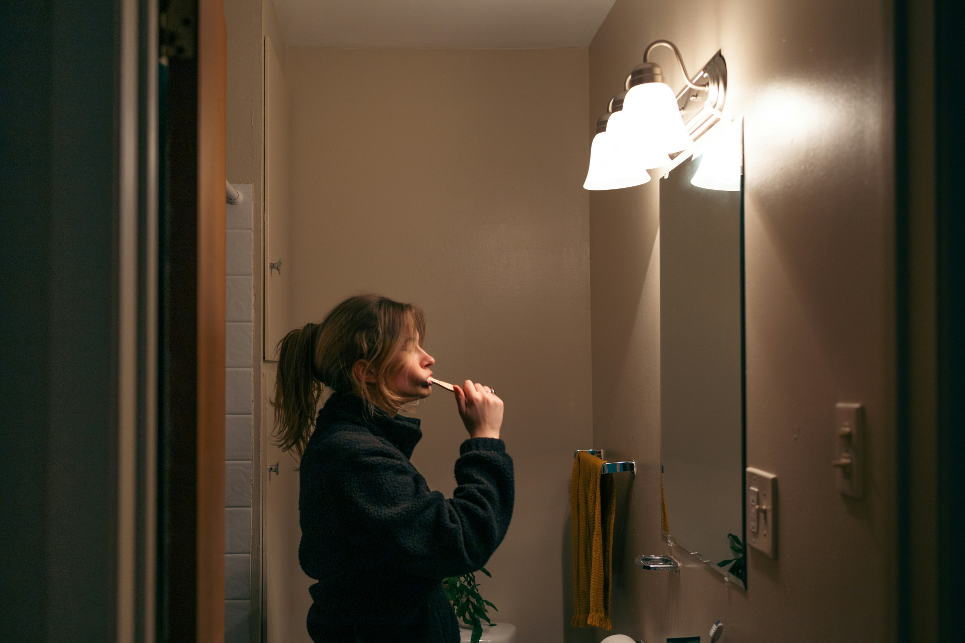 Kombiner lys fra begge sider av speilet for å unngå skygger i ansiktet. Velg lamper med nøytral hvit fargetemperatur (rundt 4000K) for naturlig gjengivelse av hudtoner.